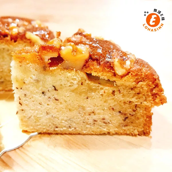 扎實的香蕉蛋糕上撒著顆顆核桃,