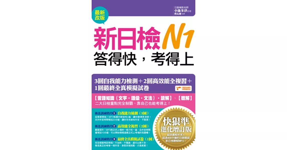 博客來-新日檢N1答得快,考得上:快狠準進化增訂版訂購網址: https://www.books.com.tw/exep/assp.php/87926/products/0010669993?utm_source=87926&utm_medium=ap-books&utm_content=recommend&utm_campaign=ap-202001
