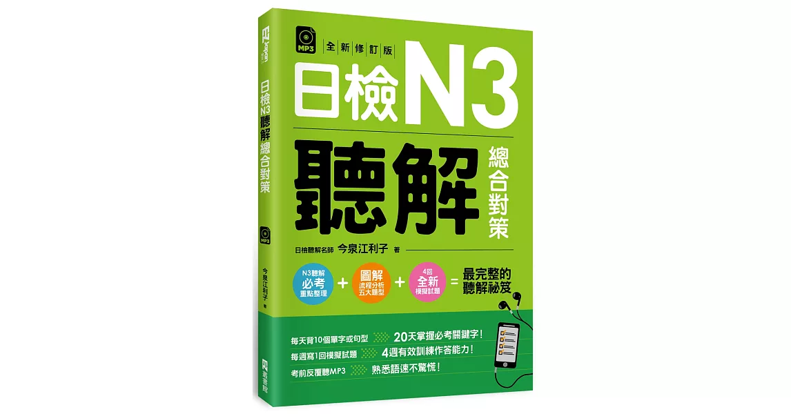 博客來-日檢N3聽解總合對策(全新修訂版)(附:3回全新模擬試題+1回實戰模擬試題別冊+1MP3)訂購網址: https://www.books.com.tw/exep/assp.php/87926/products/0010787233?utm_source=87926&utm_medium=ap-books&utm_content=recommend&utm_campaign=ap-201906