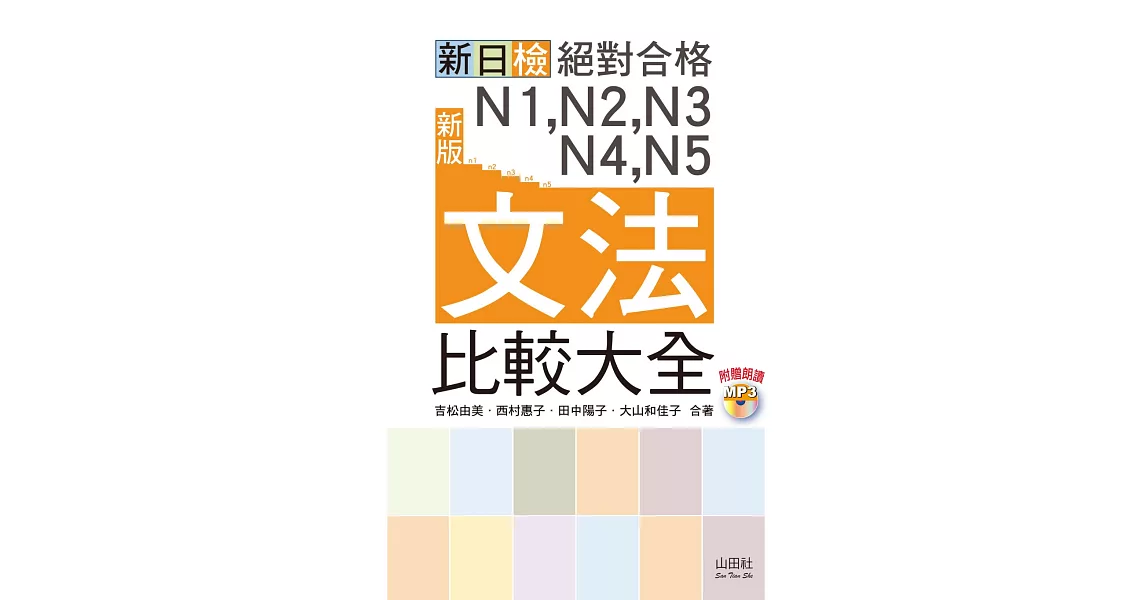 博客來-新版 新日檢 絕對合格 N1,N2,N3,N4,N5文法比較大全—隨書附贈朗讀光碟(20K+MP3)訂購網址: https://www.books.com.tw/exep/assp.php/87926/products/0010788047?utm_source=87926&utm_medium=ap-books&utm_content=recommend&utm_campaign=ap-201906