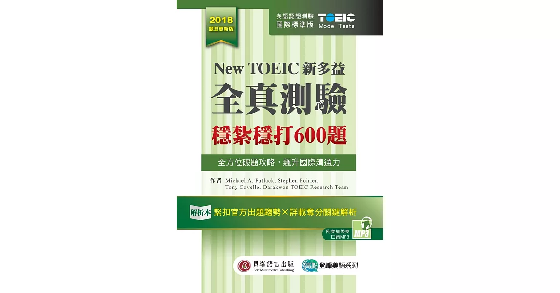 商品說明: New TOEIC新多益全真測驗:穩紮穩打600題 (解析本+試題本+1MP3+防水膠套)