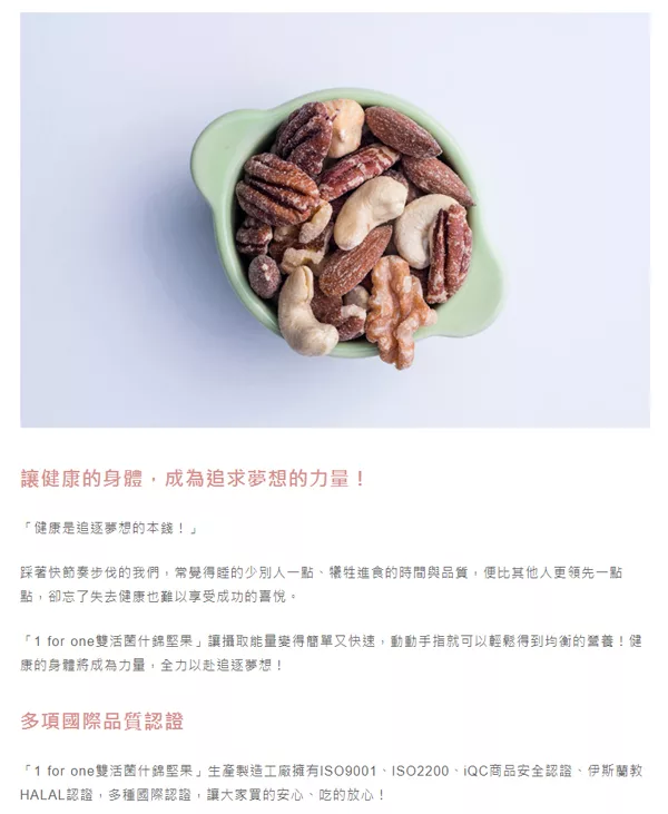 →→→→更多詳細”《1 for one》雙活菌什錦堅果(200g/罐)”介紹請點我